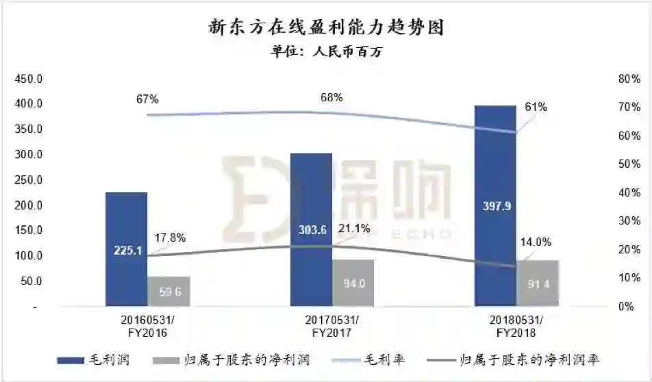 在毛利增长了9400万人民币的情况下,“新东方在线”的净利率从21.1%掉到了14.0%。数据来源:“新东方在线”招股书,制图:深响