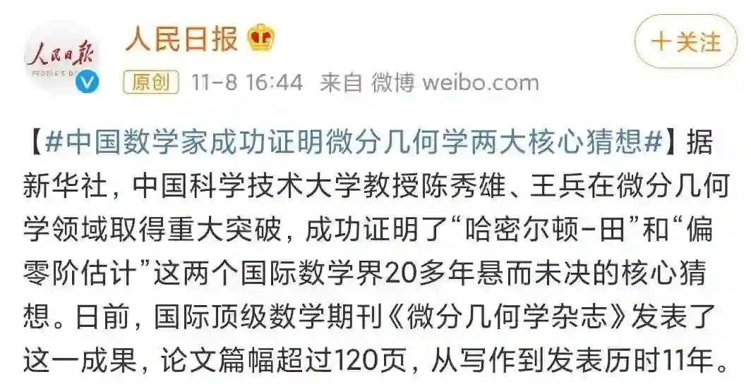 11 月 8 日,新华社报道称,中国科学技术大学教授陈秀雄、王兵在微分几何学领域取得重大突破,成功证明了「哈密尔顿 - 田」和「偏零阶估计」这两个国际数学界 20 多年悬而未决的核心猜想。论文从写作到发表历时 11 年。