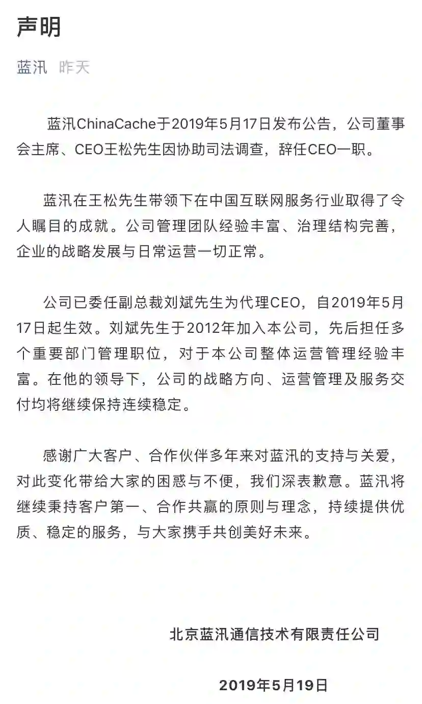 目前在蓝汛发布的公告中提到:“已经收到北京市政府检察院办公室的通知,目前正因企业贿赂指控而接受调查,聘请刑事辩护律师为相关法律程序作准备,由于法律诉讼仍处于相对较早的阶段,公司目前无法评估此类诉讼的可能结果。”