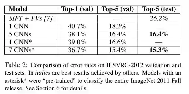 ImageNet Large-Scale Visual Recognition Challenge (ILSVRC) 2012 大赛测试集和验证集的错误率比较。斜体结果表示其他方法得到的最有结果。带星号*的结果是用“预训练”的模型来识别ImageNet 2011 Fall样本的结果。