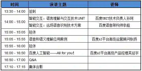 为了帮助开发者深入了解UNIT开放技术、语音能力,更加充分利用这些人工智能技术进行开发与上线——74期百度技术沙龙,我们将从UNIT核心技术解析、远场语音识别方案、语音和语义理解应用实践、百度开放平台使用指南四个维度,对百度智能交互技术做全方位的分享和解析。