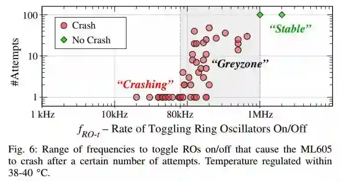 FPGA在云计算和IoT中都有大量的应用,在这些新的应用中,传统的比特流加密(bitstream encryption)等安全措施已经不足以应对新的挑战。在这项研究中,作者揭示了一个新的安全漏洞,通过一类方法可以对FPGA发动DoS攻击,并在两代FPGA上进行了实测。结果发现,仅仅利用12%的片上资源,就可以使FPGA由于欠压保护而完全瘫痪。