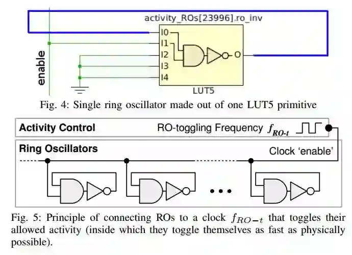 为了达到瞬间改变FPGA负载的效果,作者将一个逻辑单元的输出经过一个非门连回到输出端。如下图所示,这样的电路构成了一个正反馈的环形振荡器(Ring Oscillator)。环形振荡器里的CMOS开关管会以极快的速度翻转,消耗大量电流。大量逻辑单元都被设置成这样的环形振荡器,并且通过一个使能信号控制所有振荡器,就能瞬间改变FPGA的电流负载。通过控制使能信号的开关频率fRO-t,可以模拟不同的负载变化来观察其对FPGA的影响。