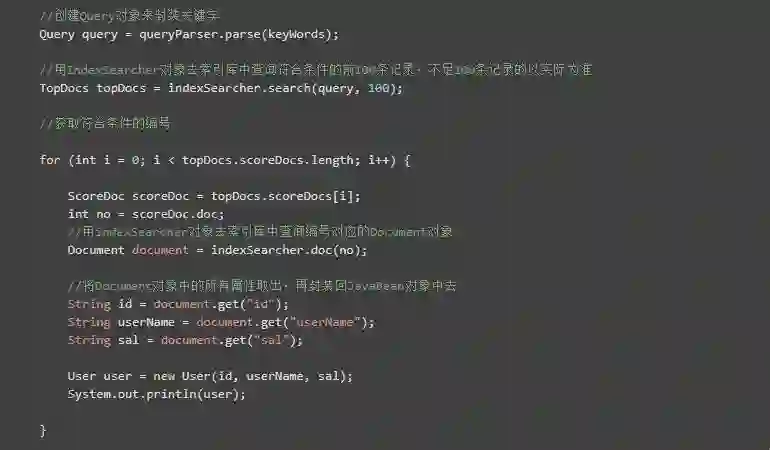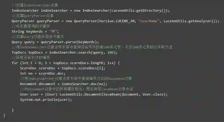 4)用IndexSearcher对象去索引库中查询符合条件的前100条记录,不足100条记录的以实际为准
