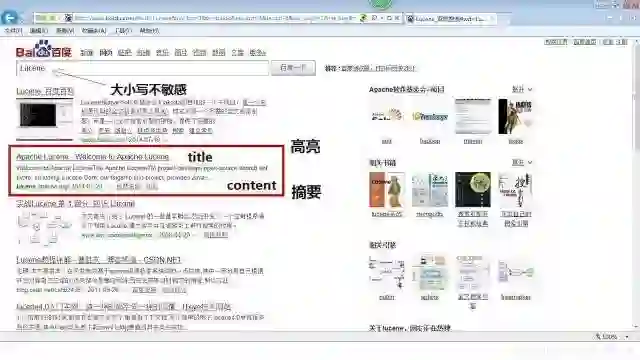 我们来看看在baidu中搜索Lucene为关键字搜索出的内容是怎么样的: