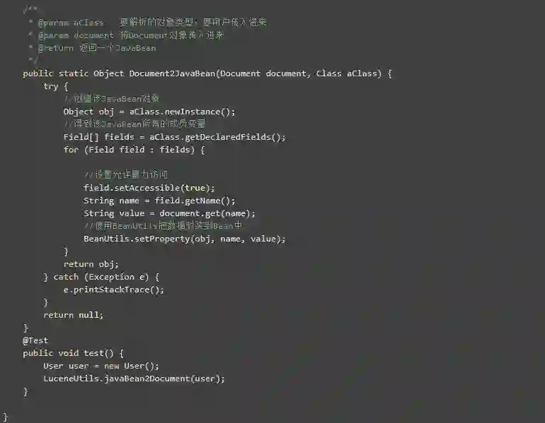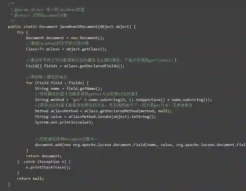 以下的代码其实就是将JavaBean的数据封装到Document对象中,我们是可以通过反射来对其进行封装....如果不封装的话,我们如果有很多JavaBean都要添加到Document对象中,就会出现很多类似的代码。