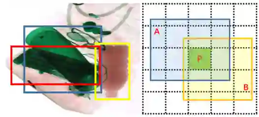 图 4 重叠示意图。图像上的每个网格对应于特征图上的一个采样点,黄色框和蓝色框定位了两个重叠的对象。