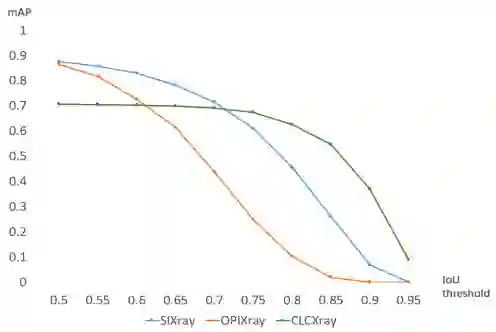 与 GDXray、SIXray 和 OPIXray 相比,CLCXray 具有以下独特的特性:首先,CLCXray 中多个对象之间的重叠更多,这是因为平均每张图像的标记对象更多。CLCXray数据集中近 60%的X光图像包含至少两个或多个前景。在SIXray和OPIXray中,只有少数X光图像包含多个对象。其次,CLCXray中的类别包含液体容器,这在以往的研究中是没有见过的。液体容器可能含有有毒、腐蚀性、易燃易爆的液体,这些液体很危险,但很容易被忽视。第三,CLCXray有更准确的bbox标注。图2显示了通过在不同数据集上训练和测试基线模型 ATSS [5]获得的折线图。OPIXray 和 SIXray 上发生的急剧下降表明模型难以从框注释中学习准确定位。此外,我们将不同数据集的注释可视化,如图 3 所示。与 SIXray 和 OPIXray 相比,CLCXray 的注释在视觉上更贴合对象边缘。