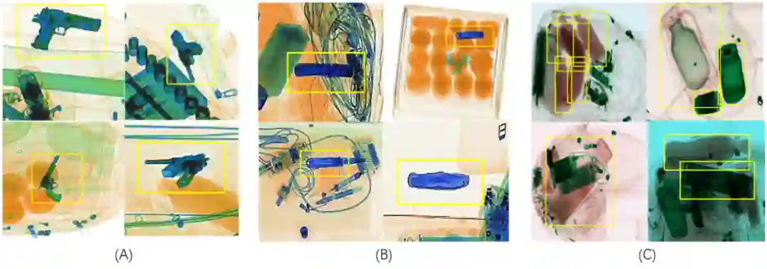 由于X光的成像原理,堆放在行李中的物品影像经常相互重叠。与光学图像中的遮挡问题不同,重叠的物体在X 光安检图像中仍然可见。然而,由于图像的重叠,对重叠物体检测受到干扰。根据重叠对象的不同,重叠问题可以分为三种类型,对象与无关背景的重叠,对象与相似背景的重叠,以及多个对象之间的重叠。以前的工作主要研究威胁品和无关背景之间的重叠。Liu等人[1]提出了一种两阶段方法,首先使用颜色信息从输入图像中分割出目标图像,然后对目标图像进行检测。Hassan等人[2]也提出了一种两阶段方法,首先使用轮廓信息从图像中分割出感兴趣区域(ROI),然后对ROI进行检测。Wei 等人[3]并没有从背景中分割对象,而是采用注意力机制使网络关注图像中物体的颜色和轮廓。此外,曹等人[4]提出使用局部外观来识别威胁对象,这需要额外的局部外观标签。然而,真实的场景是复杂的。在某些场景中,背景和物体的颜色相似,并且物体没有清晰可分离的轮廓。此外,不同对象之间存在重叠。在本文中,我们提供了一个新的数据集——刀具和液体容器的 X 光图像数据集(CLCXray)来进一步研究重叠问题。与OPIXray[3]不同,CLCXray更关注对象和相似背景之间的重叠,以及多个对象之间的重叠。 在类别上,CLCXray 数据集中有两大类威胁对象,刀具和液体容器,它们很普遍,但在之前的研究中被忽略了。CLCXray的样本如图 1 所示。