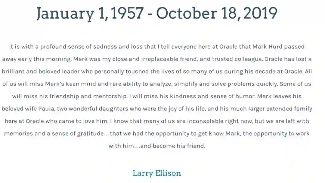 带着深深的悲伤和失落,我告知甲骨文的所有员工,马克 · 赫德今天早上去世了。马克是我亲密的、无可替代的朋友和值得信赖的同事。甲骨文失去了一位才华横溢、深受爱戴的领袖,他在甲骨文工作的十年间,触动了我们许多人的生活。我们都会想念马克敏锐的头脑和罕见的快速分析、简化和解决问题的能力。我们中的一些人会想念他的友谊和指导。我会想念他的善良和幽默感。马克离开了他深爱的妻子宝拉,两个可爱的女儿是他生命中的快乐,还有他在甲骨文的大家庭,大家都爱他。我知道现在我们很多人都伤心欲绝,但让我们留下回忆和感激之情,感激我们有机会认识马克,有机会和他一起工作,成为他的朋友。