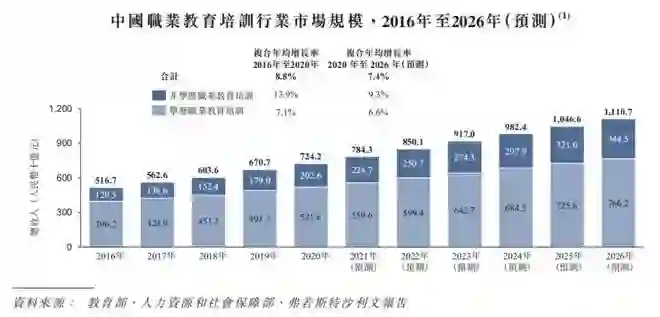 弗若斯特沙利文报告显示,中国职业教育培训行业的市场规模以收入计算,从2016年的5167亿元增至2020年的7242亿元,复合年均增长率为8.8%,预期到2026年将达到11107亿元的规模。