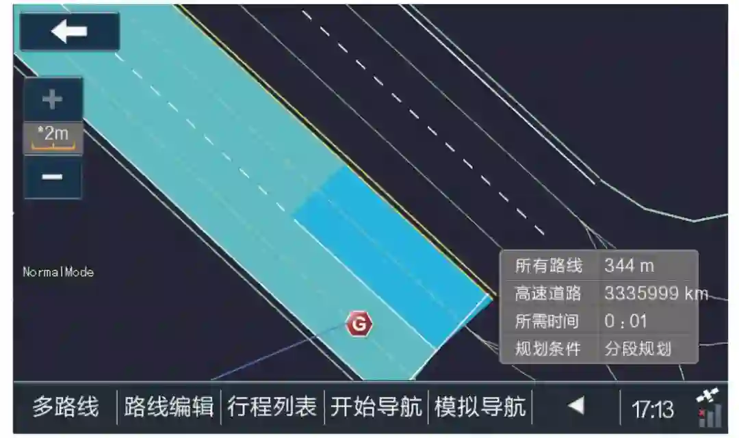 通过应用程序实现上述路径规划方法的展示结果如图 8 所示,其中 G 代表终点;浅青色代表路径规划结果,即可通行区间集合;蓝色区块代表被过滤的车道区间,该区域横向上以实线分隔车道,不能从蓝色区块变道到 G 点所在车道,即无法达到目的地,因此被排除在路径规划结果之外,而根本原因则是车道驾驶态势不同。