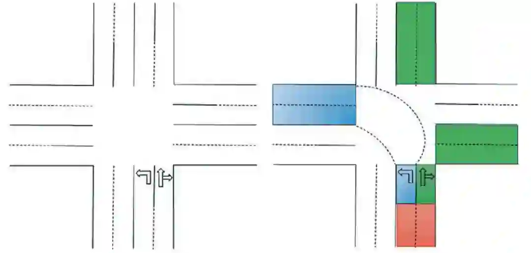 如图 1 所示,根据地面箭头标识,下方道路驶入路口的左车道只能左转,右车道可以直行和右转,虽在同一条道路,但两个车道的驾驶态势已完全不同。车道驾驶态势变化的临界线可根据车道分隔线、经验值、车辆长度和车辆动力学特性等多因素综合考虑进行划分,图 1 中根据车道分隔线虚实变化进行了划分,虚线部分(红色部分)两条车道的驾驶态势一致,可直行也可相互变道,而到达实线部分,两条车道的驾驶态势则变得不同。