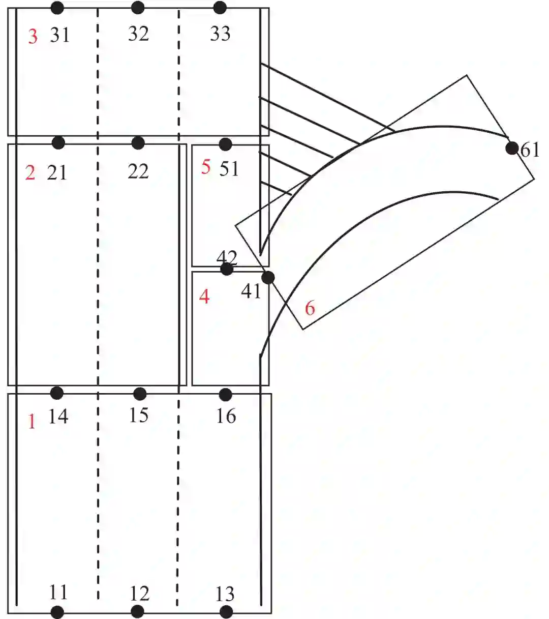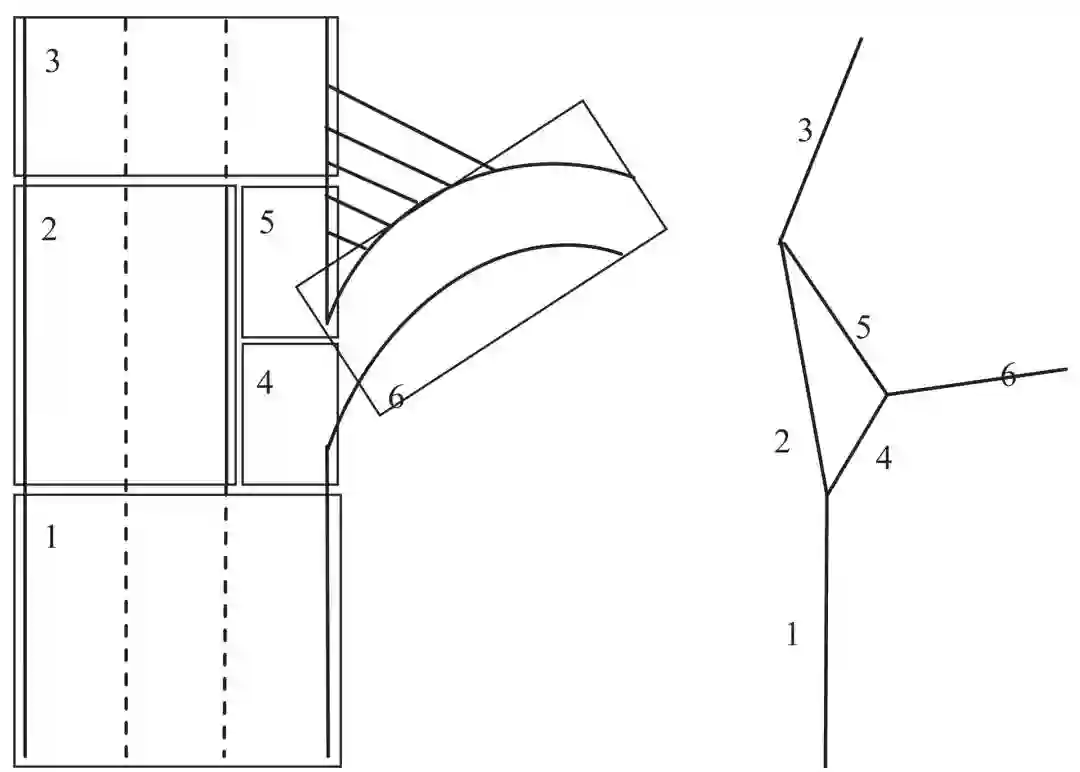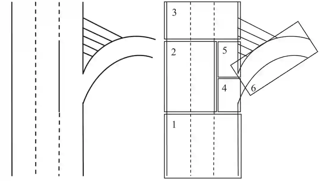 获得车道驾驶态势和划分变化临界线后,可生成车道级的可通行区间,即 lanezone。在 lanezone 内部允许车辆直行或左右变道,且保持横向水平,即 lanezone 内部车道的驾驶态势相同。如图 2 所示,左侧是常见分叉路,其中分叉路的最右侧车道一般采用实线分隔车道,若要右转则需提前变道以保障安全驾驶。根据每段车道的驾驶态势,划分出 6 个 lanezone。