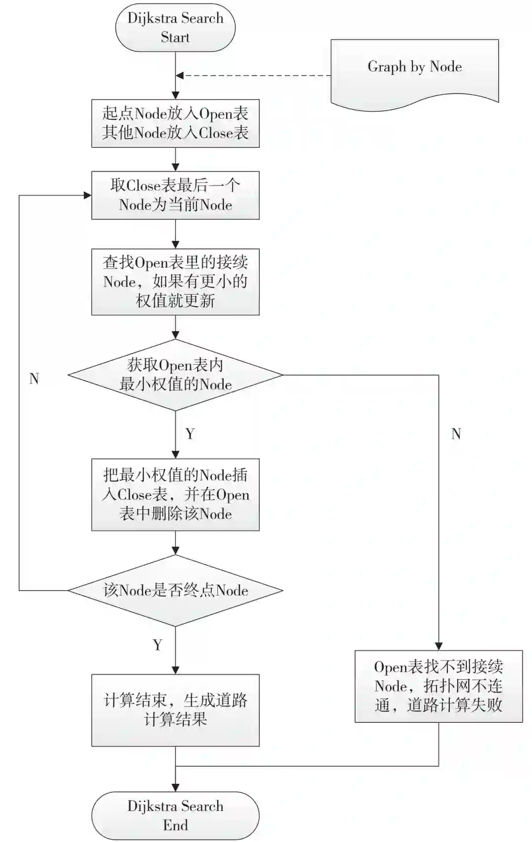 基于 lanezone 级别的拓扑关系,其实质是一种含权重的有向图,因此可以使用双向 Dijkstra 算法进行最优路径规划。首先根据定位匹配结果计算起点和终点所在的 lanezone 编号,然后从起点到终点进行正向搜索,获得起点能达到的 lanezone 序列,再从终点到起点反向搜索,获得终点能达到的 lanezone 序列,两次搜索后,将既能达到起点也能达到终点的 lanezone 放入结果,即路径规划结果。Dijkstra 算法流程如图 6 所示,Open 表保存所有已生成而未考察的节点,Close 表记录已访问过的节点。