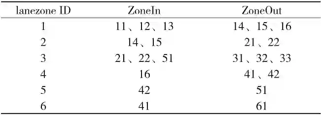 lanezone 内部拓扑关系如表 1 所示。在 lanezone 内 ZoneIn 任意一个拓扑点均可到达 ZoneOut 任意一点,因此 ZoneIn 和 ZoneOut 可以看作是 lanezone 的「接口」,只要能从 ZoneIn 驶入,就可从 ZoneOut 驶出。