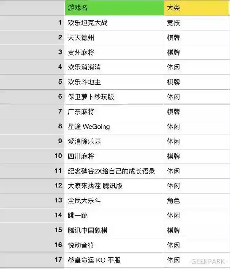 首批 17 个游戏中,棋牌和休闲类分别占了 5 个和 10 个,而其中绝大多数游戏的共性就是——多人合作或竞技性。