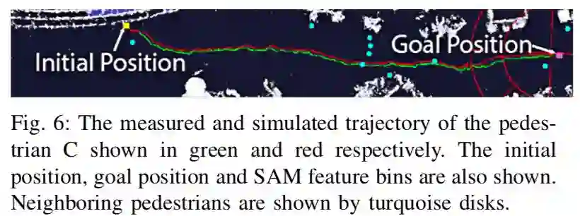 作者使用学习到的奖励函数进行了模拟实验,并通过与数据集中真实测量的行人轨迹对比来评估其性能。评估结果显示作者提出的方法在与其他最先进的方法对比中有着可以接受的预测精度,并且可以生成与人类轨迹相似,有着例如防碰撞、领导与跟随、分来与汇合等自然社会导航行为的行人轨迹。