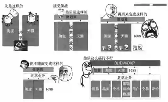 由于系统架构的缘故,当时淘宝和天猫的电商系统是完全独立的两套体系,两套电商平台都包含了商品、交易、评价、支付、物流等功能。2009年,共享业务事业部应运而生,阿里巴巴希望用这种方式将两个平台中公共的、通用的业务功能沉淀,避免重复建设和维护,更合理地利用技术资源。