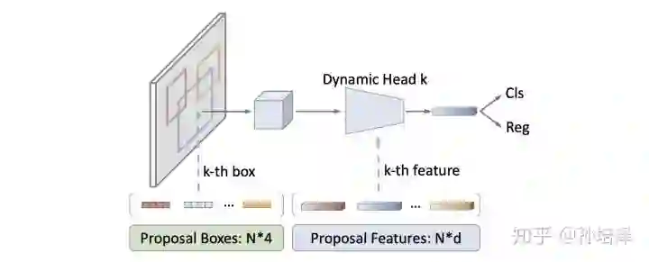 这组学习到的proposal boxes可以理解为图像中可能出现物体的位置的统计值,这样coarse的表征提取出来的RoI feature显然不足以精确定位和分类物体。于是,我们引入一种特征层面的candidates,proposal features,这也是一组可学习的参数,N*d,N代表object candidates的个数,与proposal boxes一一对应,d代表feature的维度,一般为256。这组proposal features与proposal boxes提取出来的RoI feature做一对一的交互,从而使得RoI feature的特征更有利于定位和分类物体。相比于原始的2-fc Head,我们的设计称为Dynamic Instance Interactive Head.