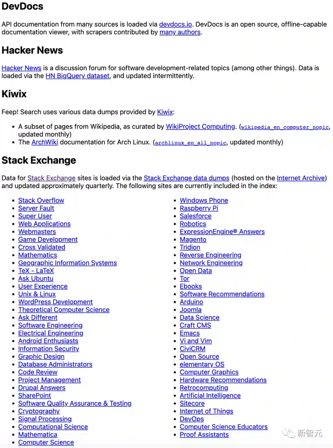 目前,「Feep! search」能够检索的信息源,包括DevDocs、Hacker News、Kiwix、Stack Exchange等,甚至还包括一些已索引但未爬网的链接,信息总量超过2900万页——这甚至比谷歌1998年推出的第一款搜索引擎还要多(2600万页)。