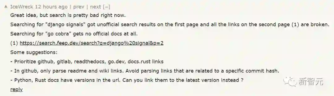 「好主意,但现在的搜索很糟糕。对『django signals』进行检索,第一页得到了非官方的结果,第二页(1)上的所有链接都断了。搜索『go cobra』则根本没有官方文档。」还在最后提出了一些改进建议。