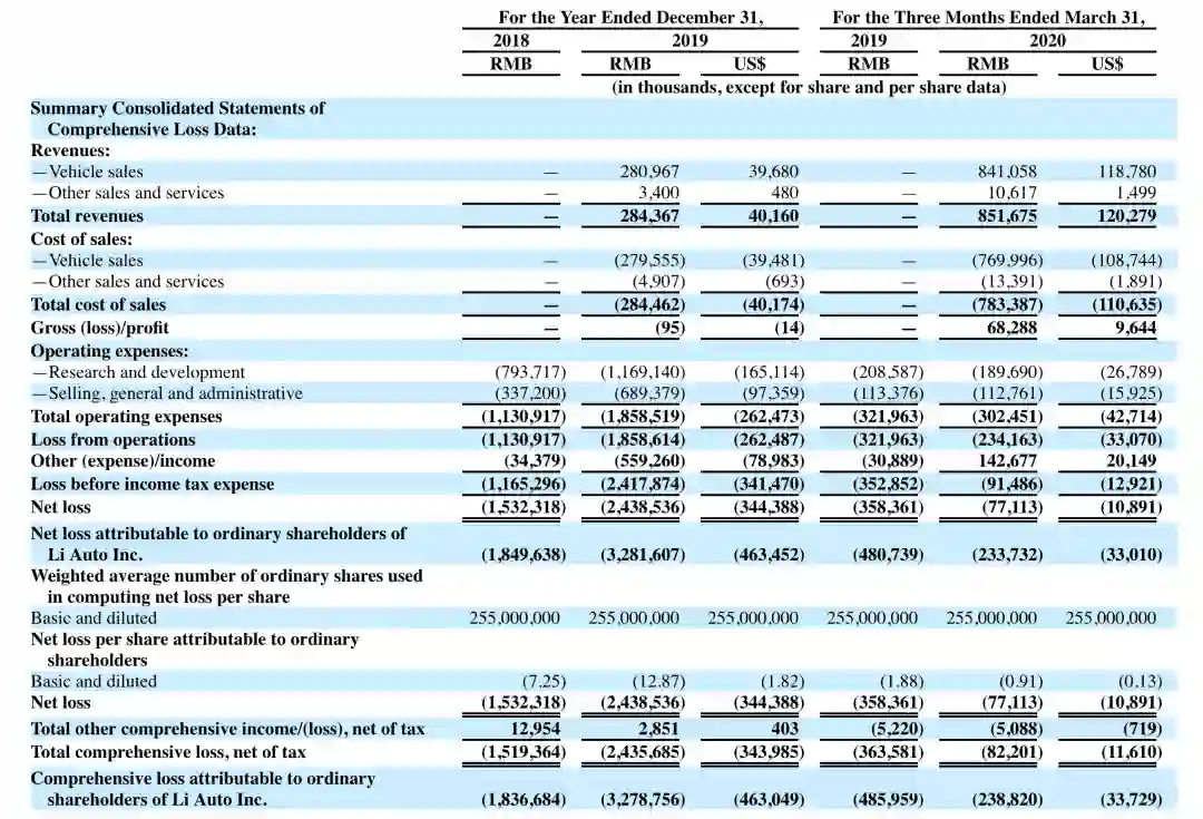 招股书显示,理想汽车在2018年无营收,2019年营收为2.84亿元,2020年第一季度营收为8.517亿元。 此外,2018年、2019年理想汽车分别净亏损为15.32亿元、24.38亿元;理想汽车2020年第一季度净亏损为7711万元,上年同期净亏损为3.58亿元。