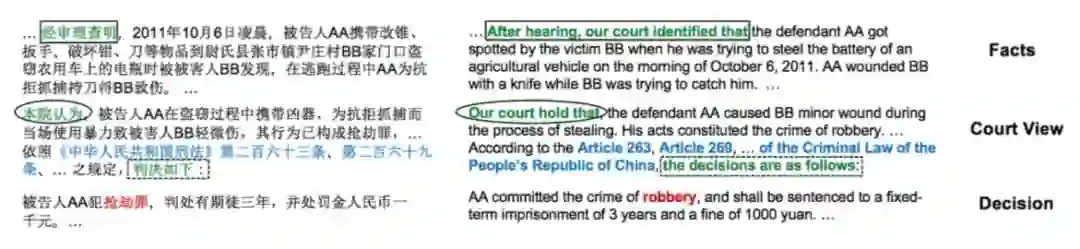 对于法条部分,考虑刑事法律,结果数据集中包含50个不同的罪名,321条不同的相关法条,每个事实描述平均383个词,根据下图,高亮的部分,能够很容易通过正则表达式抽取相关特征。