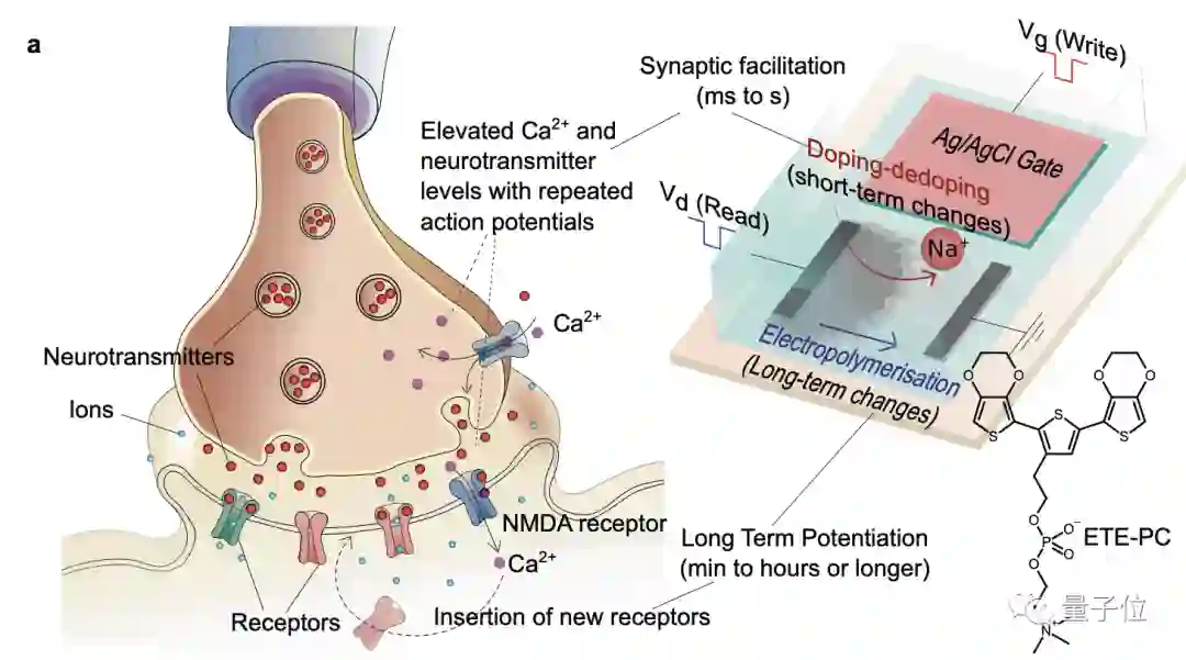 突触与神经元采用相同的结构制造,通过在通道中施加栅极电压脉冲,使人工突触导电性可以长期增加: