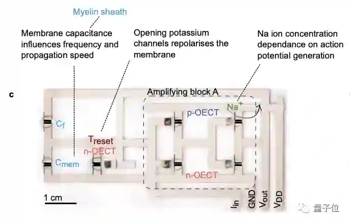 而人造神经元则通过向输入端注入电流产生尖峰,实现一种类似的动作电位的传导,还能调节电解质的离子浓度控制尖峰频率。