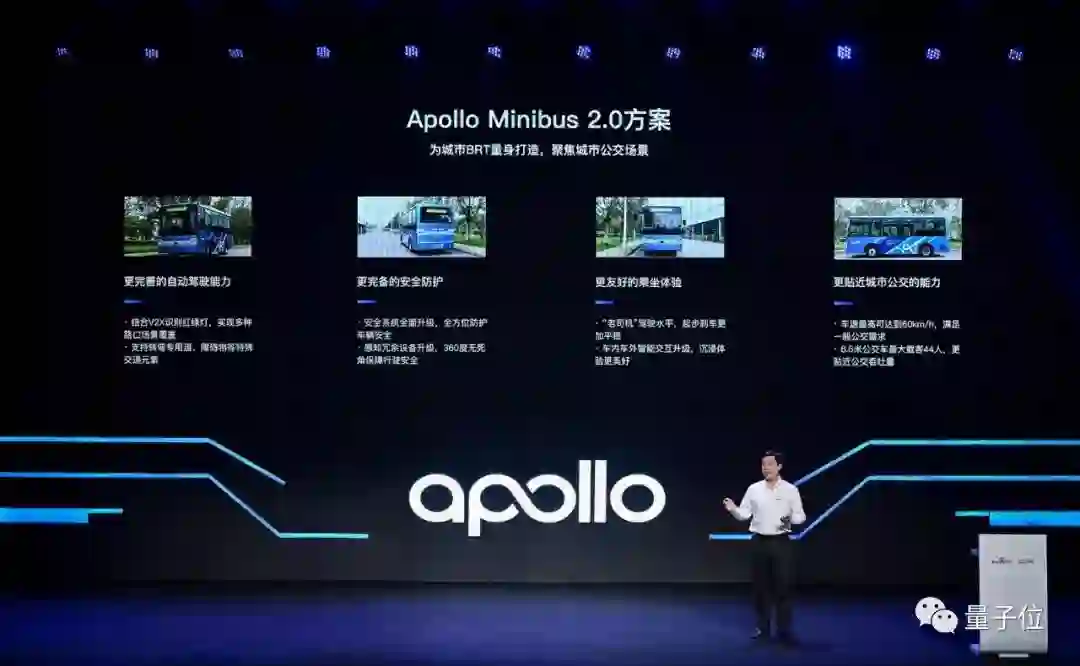 Apollo Minibus 2.0方案,王京傲在发布会上说,Minibus 2.0为城市BRT量身打造,比普通公交车行驶更平稳,实现最高时速60公里每小时,载客44人,金龙客车、宇通客车等企业都是该方案的客户。