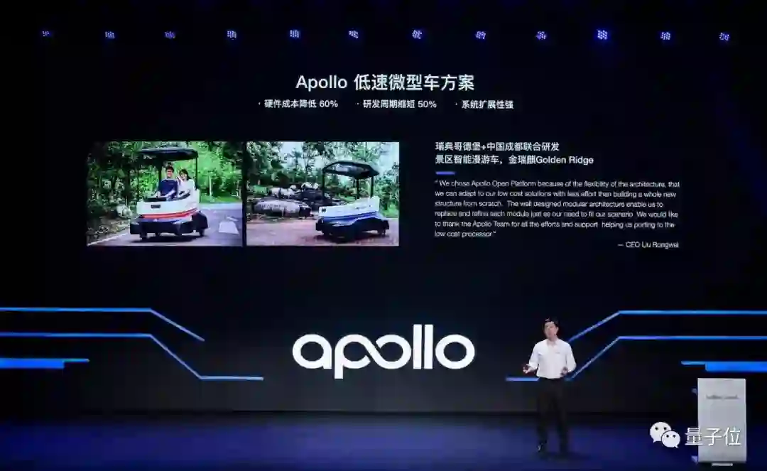 Apollo低成本低速自动驾驶方案,针对景区漫游、自动清扫、快递配送等低速场景,基于ARM构架,将打造自动驾驶的硬件成本降低60% ,研发时间缩短 50%,门槛更低。