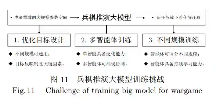 博弈理论,作为研究多个利己个体之间的策略性交互而发展的数学理论,有望为兵棋推演人机对抗突破提供理论支撑,但是面临着如何求解以及保证大规模博弈的近似纳什均衡解的挑战。大模型,近些年来在自然语言处理领域获得了突飞猛进的发展,兵棋推演的大模型训练有望实现类似的零样本或小样本迁移,但是面临着如何进行优化目标设计、多智能体训练以及不同规模任务训练的挑战。问题约简,作为一种引导技术发展的有效手段,本文设计了“排兵布阵”、“算子异步协同对抗”等问题,以牵引算法研究,进而反哺解决兵棋推演人机对抗挑战。