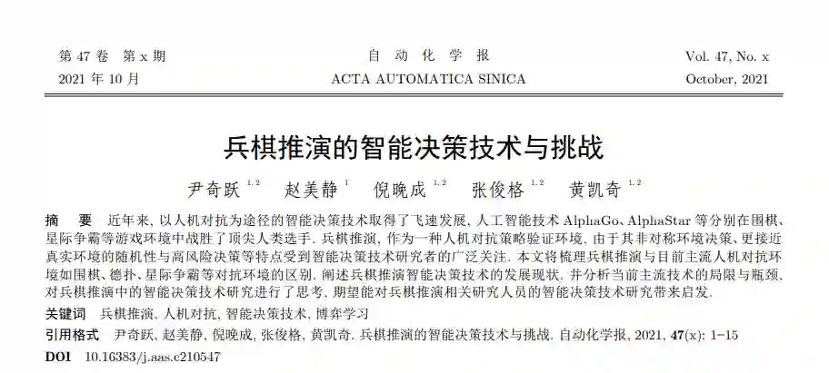 尹奇跃, 赵美静, 倪晚成, 张俊格, 黄凯奇, 兵棋推演的智能决策技术与挑战. 自动化学报, 2022, 48(x): xx-xx