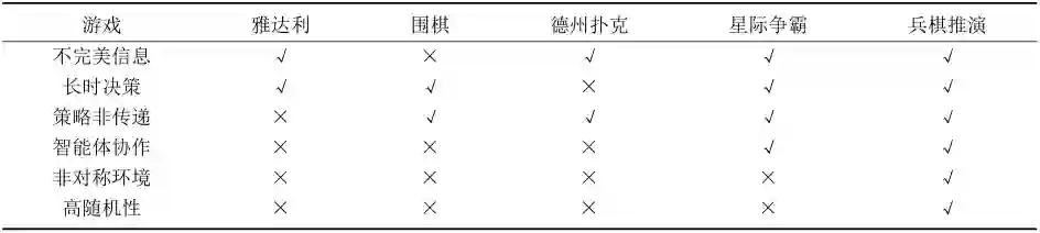 兵棋推演, 一直以来都是战争研究和训练的手段, 分为早期的手工兵棋与 20 世纪 80 年代后期普 及的计算机兵棋[15−17] . 胡晓峰等人[6] 全面综述了兵 棋推演的基本要素 (参演人员、兵棋系统模拟的战 场环境和作战部队、导演部及导调机构), 指出 “兵 棋推演的难点在于模拟人的智能行为”, 进而得出 “兵 棋推演需要突破作战态势智能认知瓶颈”, 最后给 出了如何实现态势理解与自主决策可能的路径. 和 目前兵棋推演关注的重点不同, 本文关注的是兵棋 推演中的智能体研究, 针对通用性的智能决策技术 与挑战展开. 另外, 需要阐明的是, 本文中的兵棋推 演, 如非特别阐述, 在不引起歧义的前提下统一指 双方计算机兵棋推演 (红蓝两方). 本文内容组织如下: 第二章将梳理兵棋推演与 目前主流人机对抗环境如星际争霸等的区别, 以及 为什么其潜在是人机对抗的下一个挑战; 第三章将 介绍兵棋推演智能技术的研究现状; 之后在第四章 阐述当前主流技术的瓶颈; 第五章对兵棋推演的智 能决策技术进行展望与思考, 希望启发新的研究方 向; 最后对全文进行总结.