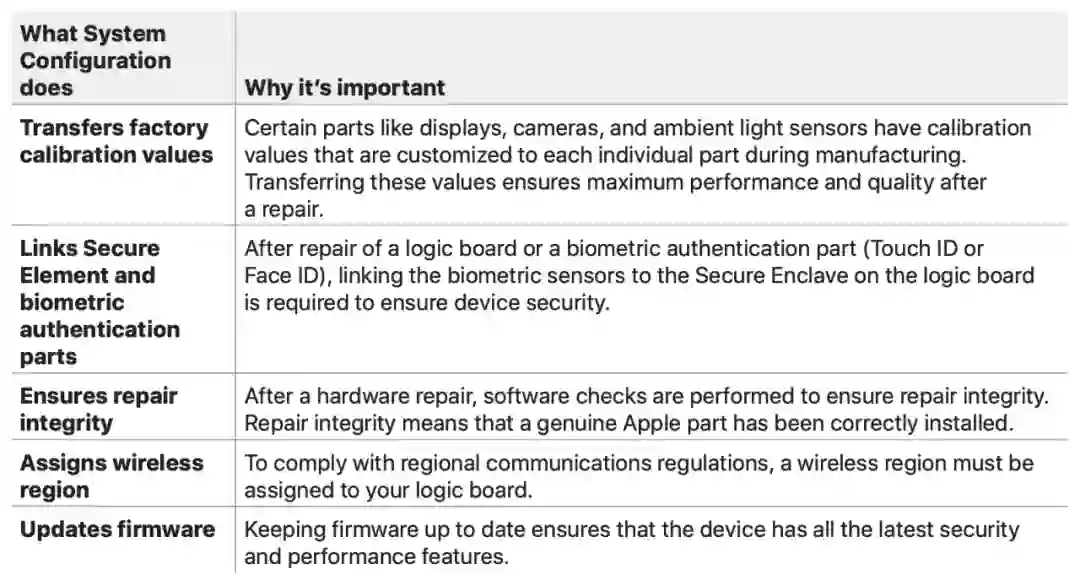 修复结束后,可能需要系统配置步骤。系统配置是一个软件工具。运行系统配置有许多目的,这些目的根据所替换的部件而有所不同。