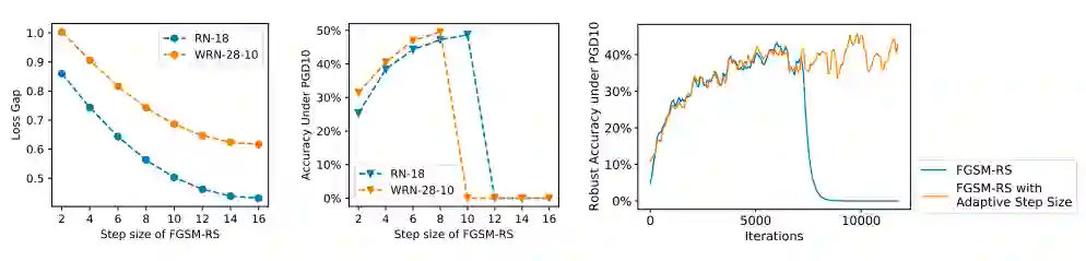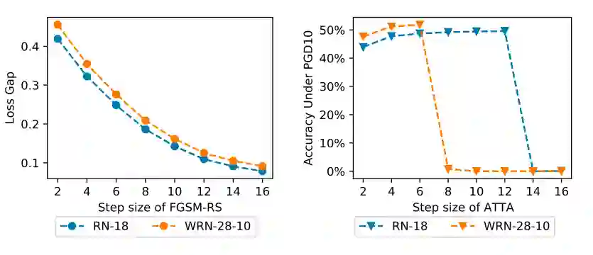 为了防止模型过拟合现象,FGSM-GA 添加了一个正则化器,用于对齐输入梯度的方向。另一项工作从损失函数的角度研究这一现象,发现模型过度现象是损失面高度扭曲的结果,并提出了一种通过沿梯度方向检查损失值来解决模型过拟合的新算法。然而,这两种算法都需要比 FGSM-RS 和 ATTA 更多的计算量。