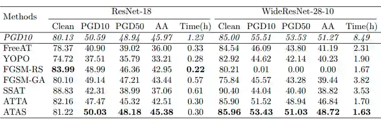 以下三个表格分别显示了不同方法在 CIFAR10、CIFAR100 和 ImageNet 数据集上的准确性和训练时间。需要注意的是,由于计算复杂性,作者没有足够的计算资源在 ImageNet 上执行标准对抗训练和 SSAT。作者使用两个 GPU 来训练 ImageNet 的模型,对于 CIFAR10 和 CIFAR100,作者在单个 GPU 上评估训练时间。从以下结果可以直观的发现论文中提出的方法 ATAS 提高了在各种攻击(包括 PGD10、PGD50 和自动攻击)下的分类模型的鲁棒性,并且可以发现在训练中避免发生模型灾难性过拟合现象。