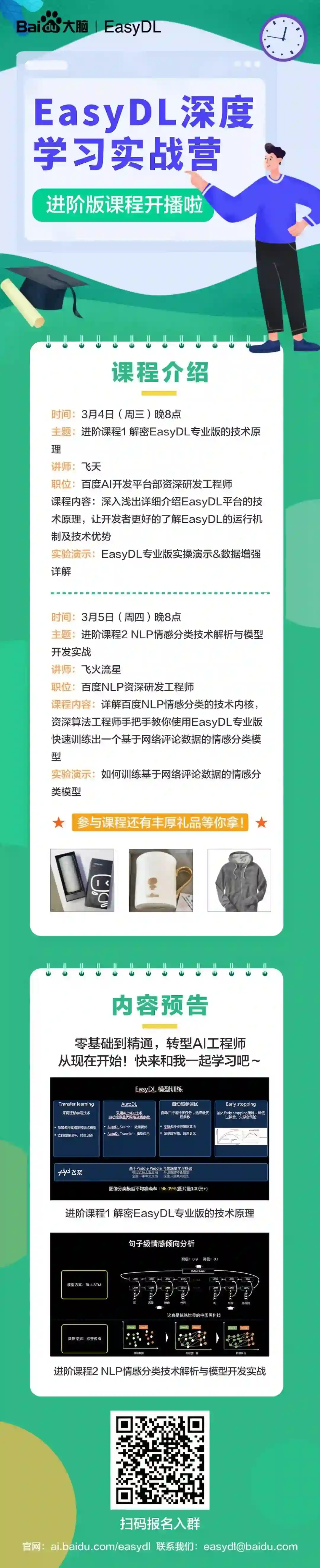 下周三百度大脑 EasyDL 深度学习实战营将开启进阶课程系列,将包括多场NLP相关的直播课,特别是下周四3月5日将带来一场情感分析实战课程,感兴趣的同学不要错过: