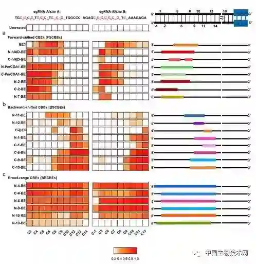 图注: CBE系统的分类,CBE系统的活性窗口定义为sgRNA中编辑效率>40%的C位点。 (a) 前置型CBE(FSCBEs),其活性窗口主要位于sgRNA靶位点的前端(PAM位点看作最末端)。 (b)后置型CBE(BSCBEs),活性窗口主要位于sgRNA靶位点的后端。 (c)广谱型CBE(BRCBEs),活性窗口横跨sgRNA靶位点的前后端。