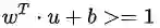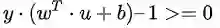 为负样本。w表示与分割线垂直的法向量,u为特征空间中的坐标,b代表分割线上任意点在w方向上的投影,1为增强模型鲁棒性的归一化指标,算法目标就是求解w与b。