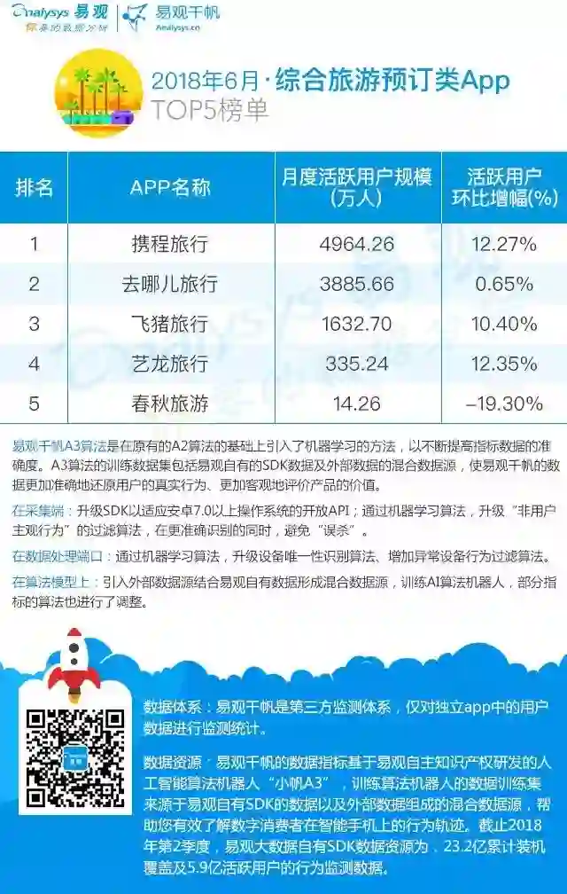 2018年6月,综合旅游预订类App TOP5榜单中,携程旅行、去哪儿旅行和飞猪旅行分别以4964.26万、3885.66万和1632.70万的活跃用户规模,依次位列榜单前三甲。