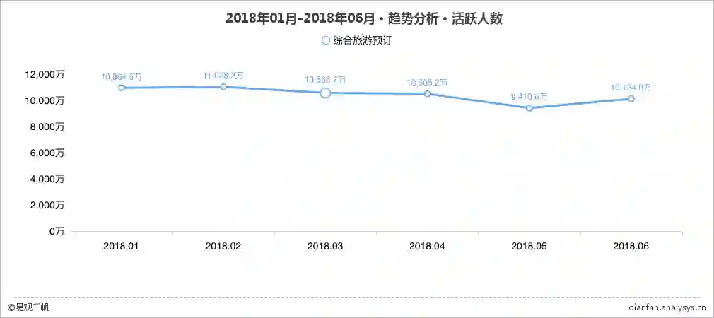 6月迎来暑期旅游热,具有季节性特征的避暑游和毕业游,都直接为各大旅游预订平台贡献了大量活跃用户,正式拉开旅游旺季序幕。根据易观千帆监测,2018年6月份,综合旅游预订类App活跃人数用户规模上升至10124.89万,环比增长7.6%。整体来看,经历了之前的季节性低谷,综合旅游预订类App已经随着旅游旺季的到来开始进入用户规模的上升通道。