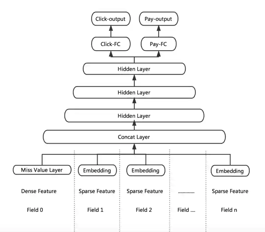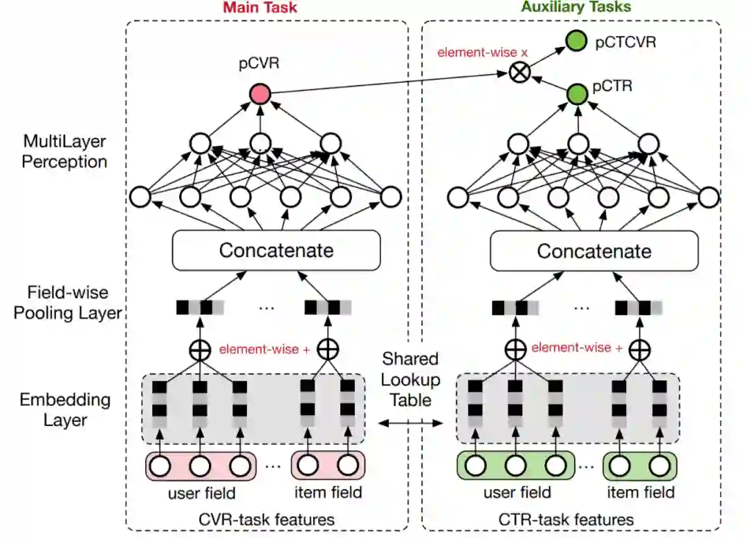 中间层是转化率和点击率部分各自利用完全隔离的神经网络拟合自己的优化目标,最终将两者相乘得到pCTCVR。