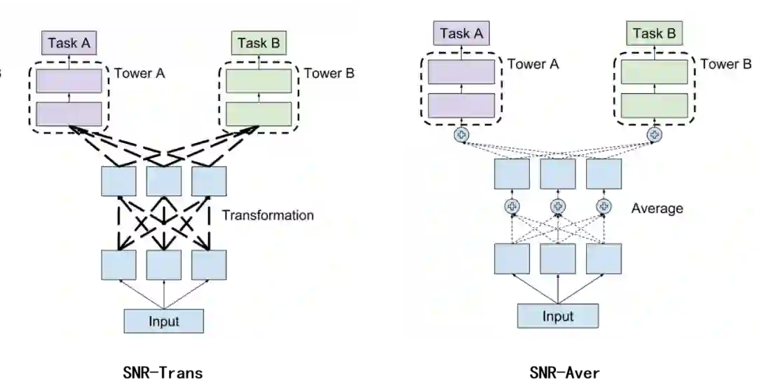 由于前面两种网络结构均存在较多的共享区域,显得不够灵活和性能消耗过大,因此近年来借助NAS技术可保留经典底层共享网络结构性能优势的同时实现更灵活的参数共享为MTL网络设计提供了新思路。谷歌提出的SNR[10]与MMoE类似,也将共享的底层网络模块化为子网络,不同的是前者使用编码变量来控制子网络之间的连接,通过NAS技术可以学习子网络的最优组合,即搜索得到一个针对给定多任务场景的最优网络结构,并且设计了两种类型的连接方式:SNR-Trans和SNR-Aver,如下所示。