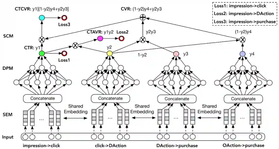 从模型结构中可以看到,总共有四个子任务,但是损失函数一共有三个,分别是:Impression→Click、Impression→Click→DAction和Impression→Click→DAction/OAction→Buy