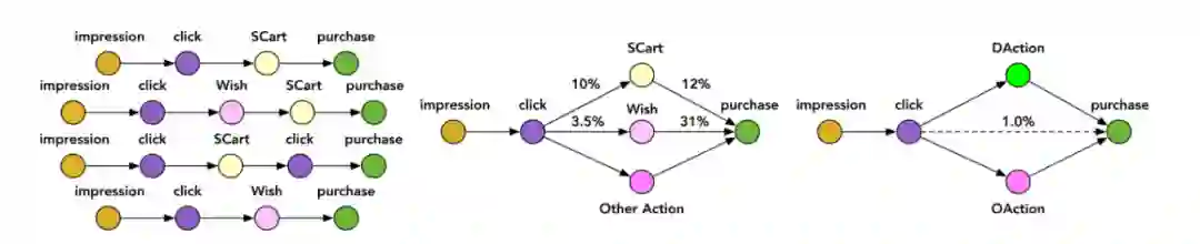 那么可以把加入购物车或心愿单的行为定义为Deterministic Action (DAction),表示购买目的很明确的一类行为。而其他对购买相关性不是很大的行为称作 Other Action (OAction)。那原来的Impression→Click→Buy 购物过程就变为:Impression→Click→DAction/OAction→Buy过程。