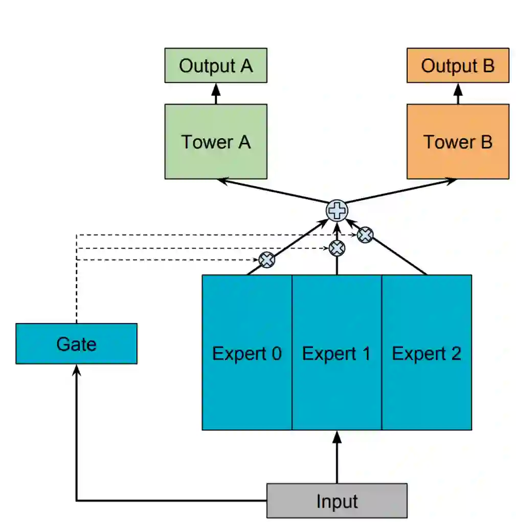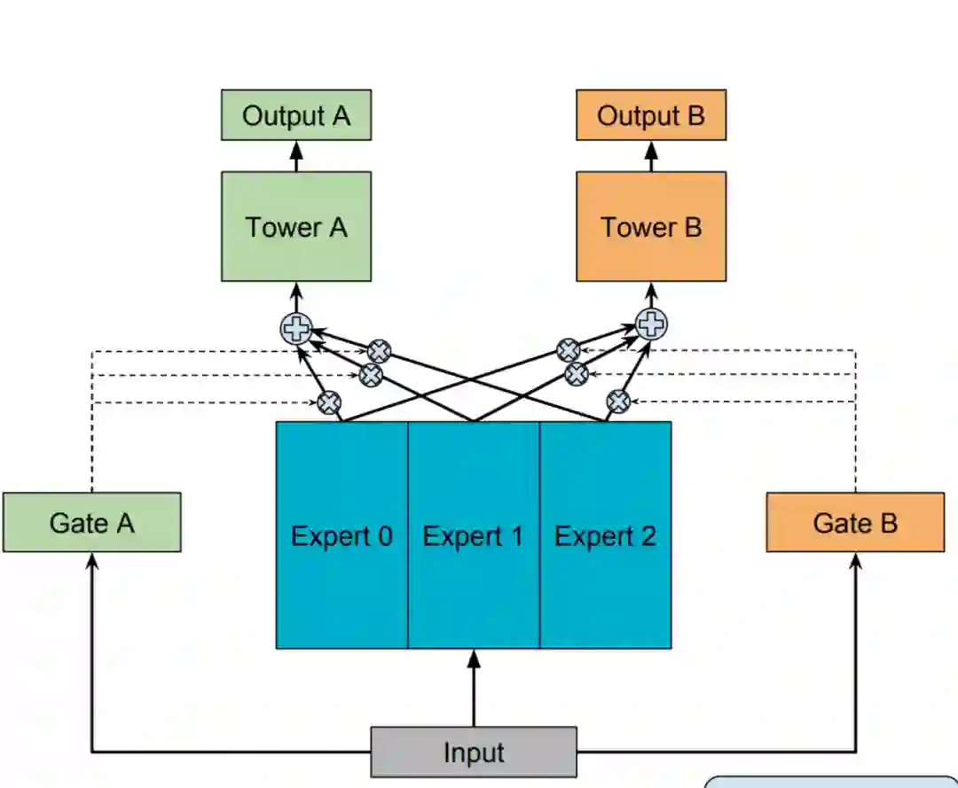 两者的共同点都是把原先Hard-parameter sharing中底层全连接层网络划分成了多个子网络Expert,这样的做法更多是模仿了集成学习中的思想,即同等规模下单个网络无法有效学习到所有任务之间通用的表达但通过划分得到多个子网络后每个子网络总能学到某个任务中一些相关独特的表达,再通过Gate的输出(Softmax)加权各个Expert输出,送入各自多层全连接就能将特定任务学习地较好。