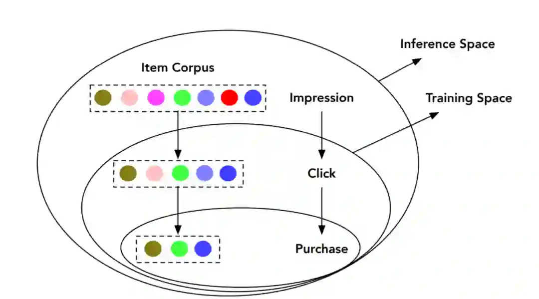 在推荐系统中,不同任务之间通常存在一种序列依赖关系。在电商中的多目标预估一般是点击率和转化率,其中购买这个行为只有在点击发生后才会发生。因此这是一种序列依赖关系,可以被利用来解决一些任务预估中存在的SSB和DS问题。第一个问题主要是训练转化率预估模型时采用的是点击+转化数据,而用户登录后直接看到的并不是具体的商品详情页,而是首页或者列表页,因此转化率预估模型需要在产品曝光的场景下进行预估,这就导致了训练场景与预估场景(全样本空间)不一致的问题,不同场景肯定会产生有偏的预估结果,进而导致应用效果的损失。第二个问题是指转化率预估模型的训练样本通常远小于点击率预估模型,如下图所示。