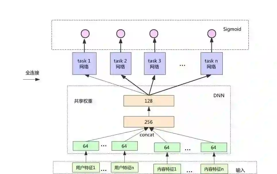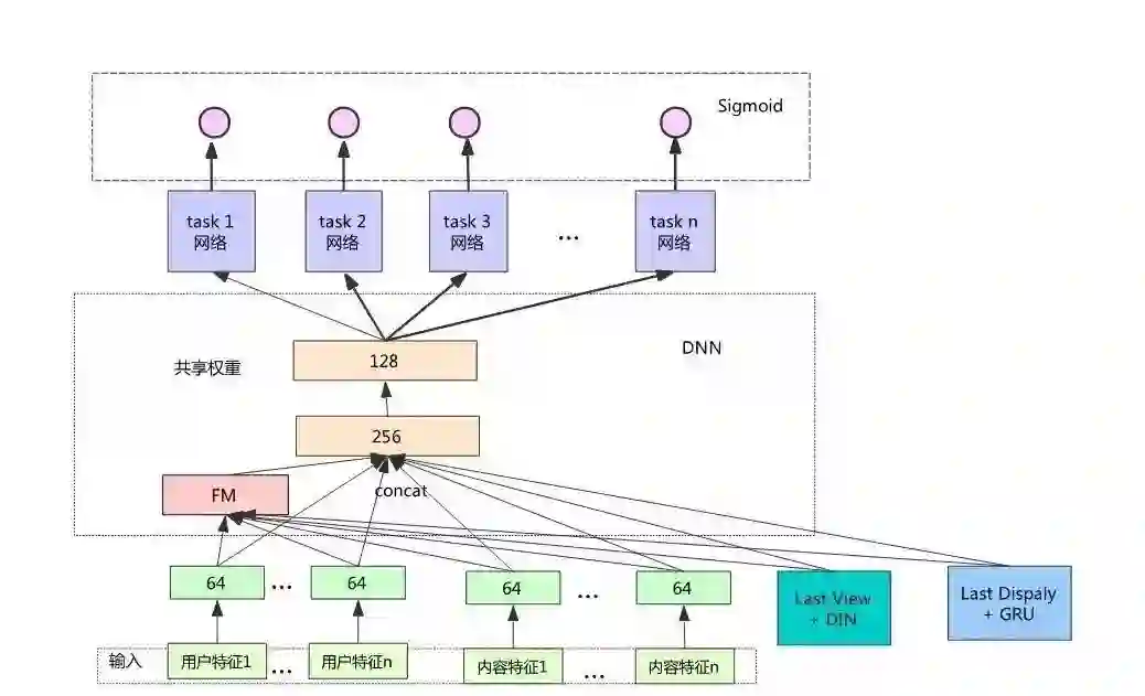知乎推荐页深度排序模型演进之路主要是:Multi-task DNN—>引入Last View(DIN) 和Last Display(GRU)的Multi-task DNN。先介绍下Multi-task DNN,和传统的Hard-parameter sharing几乎一致,每个task共享前面的几层权重,Loss可以是几个task的loss做简单的线性加权,上线要确定各个预估目标的加权值,经验比较重要,上线后显示点击率基本不变,而其余指标均大幅提升,证明多任务学习框架能有效地提升业务指标,增大收益。
